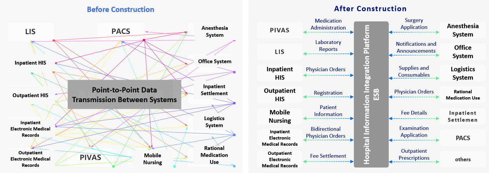 Comparison Before and After ImplementationBy implementing a data bus ESB integration engine, the system transitions from a 'tight coupling' mode to a 'loose coupling' mode, achieving integration of business systems and breaking down 'information silos' and 'information stovepipes' within the organization. |